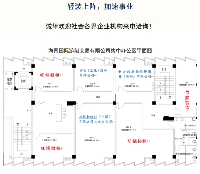 海南國際游艇交易中心集中辦公區建筑面積為385.36平方米,共有7間辦公室,面積各在40~90平方米不等。目前已有法國必維船級社(中國)等游艇巨擘入駐。現有4間旺鋪待租,租賃截止日為2024年10月5日。